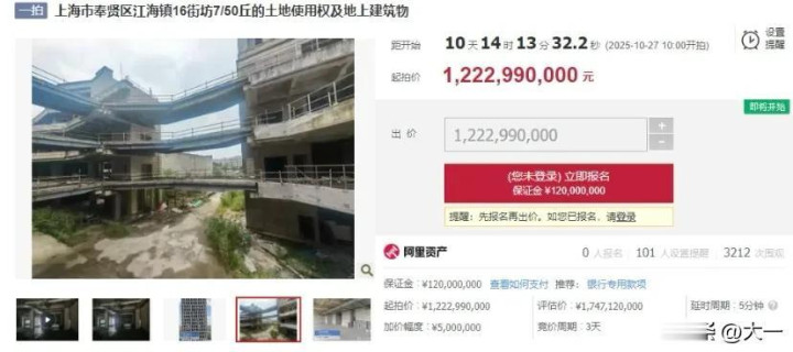 奉贤富力万达广场的法拍,起拍价定为12.2299亿元,保证金1.2亿元,增价幅度500万元及其倍数。竞价周期为3天,从10月27日10时至10月30日10时止。